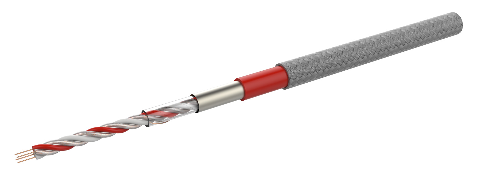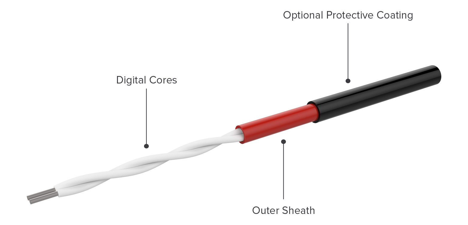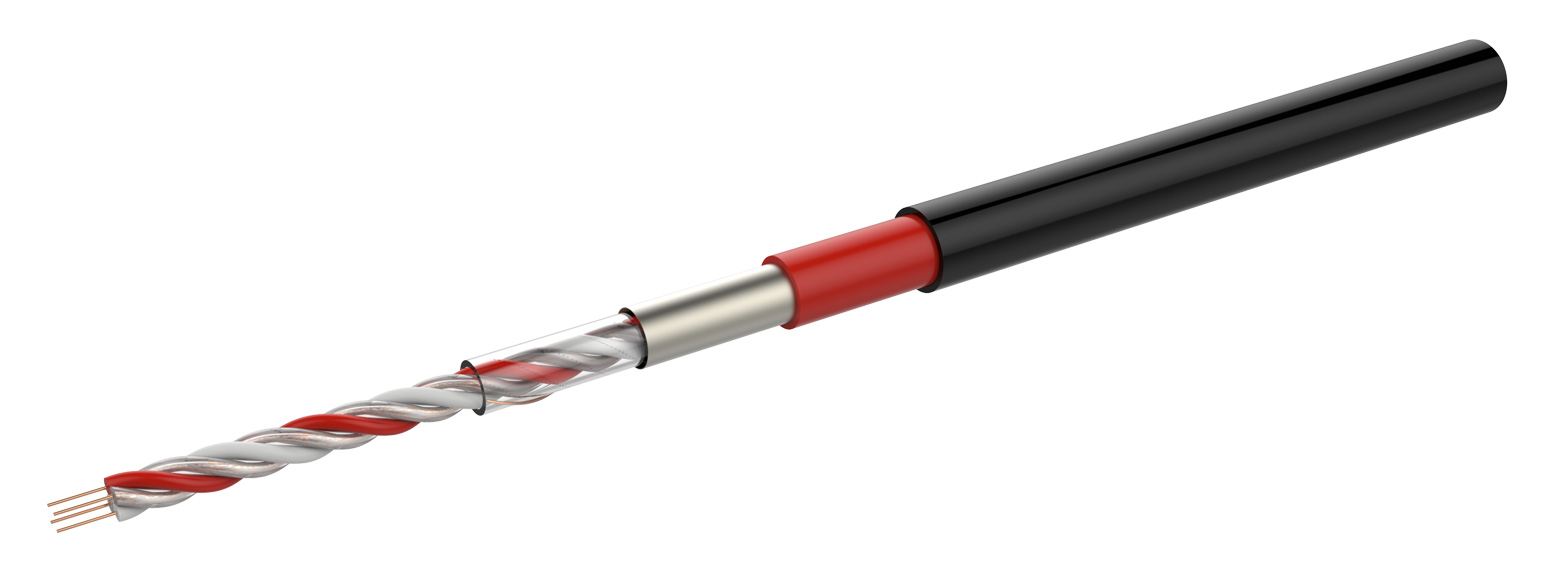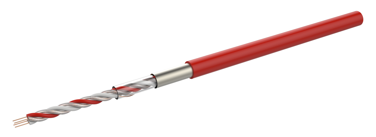 FyreLine Analogue Linear Heat Detection cable is constructed using a pair of copper conductors coated in a temperature sensitive polymer whose resistance changes as a function of temperature. A calibration resistance (white) and average ambient temperature sensor (red) core are twisted with the two original conductors. A foil shield, outer sheath and optional protective coating is extruded over the twisted cores.