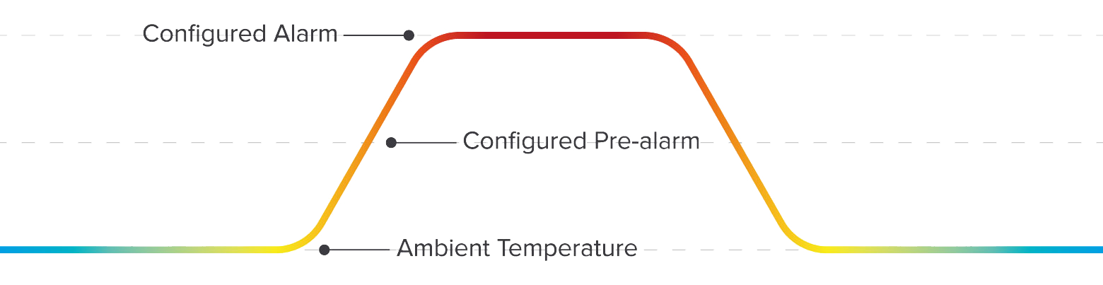 When the temperature around the cable reaches pre-alarm temperature the control module triggers a warning, giving the user time to investigate and take any necessary action. The control module will only trigger full alarm when the temperature reaches a specified alarm point.